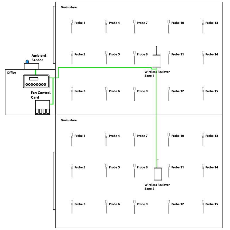 The AVC300 utilizes ambient temperature and humidity as well as crop temperature probes to control the ventilation fans in a grain store. Set points allow you to control how dry the air should be as well as setting the temperature you would like the crop cooled down to. Based on these settings the AVC will bring on an off the ventilation fans when the conditions are right.